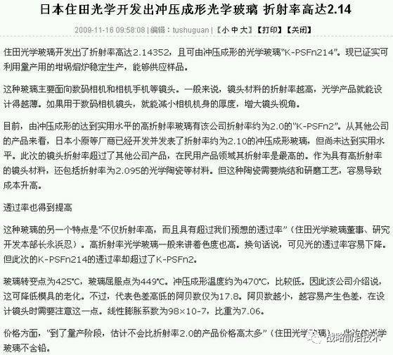 世界先进光学玻璃制造商有日本保谷光学Hoya,日本小原光学Ohara,日本住田光学Sumita,德国肖特光学Schott。其中日本住田光学Sumita保有精密模压而成的光学玻璃的,世界最高折射率,世界最低成形熔点,世界最多品种数量记录。日本住田光学Sumita的光学玻璃无论在制造工艺,还是在产品种类上全面领先其他同行。