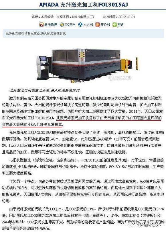 搭载业界首款4kw级光纤发振器的世界最快光纤激光金属切割机——天田FOL3015AJ。