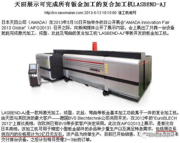 日本amada在2000年推出的畅销欧洲的astro-540 interpro机型基础上开发出了世界首台将激光溶接-成型-攻丝-折弯4项钣金制造工序集成于一体的复合钣金加工机LASBEND-AJ;当选德国权威机械技术杂志maschinemarket评出的2013年度最佳革新技术奖。并已从欧洲和日本获得数台订单,第一台设备将纳入德国钣金部件制造商BVS GmbH。