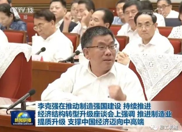 柳工集团董事长曾光安作为三个发言企业的代表之一,首先代表制造业,围绕提升制造业竞争力向李克强总理做汇报。原计划八分钟的发言,总理兴致勃勃地与曾光安董事长交流互动近三十分钟。曾光安董事长简要介绍了工程机械行业和柳工的发展情况,具体针对中国制造业转型升级提出了五点建议,分别是:提高中国制造业的国际竞争力;支持制造业的技术创新和智能制造;加强行业协会的管理,规范行业竞争秩序;培养一支可持续发展的制造业人才队伍,包括具有国际经营能力的企业家队伍,世界级的研发队伍和工匠队伍;适度降低制造业的经营成本,包括税收、物流和融资成本。