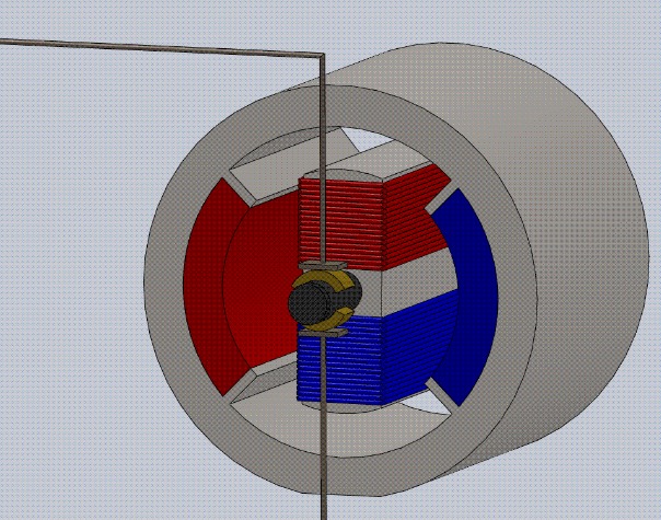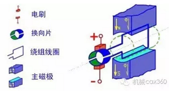 上图的直流电机的物理模型图,固定部分有磁铁,这里称作主磁极;固定部分还有电刷。转动部分有环形铁心和绕在环形铁心上的绕组。(其中2个小圆圈是为了方便表示该位置上的导体电势或电流的方向而设置的)