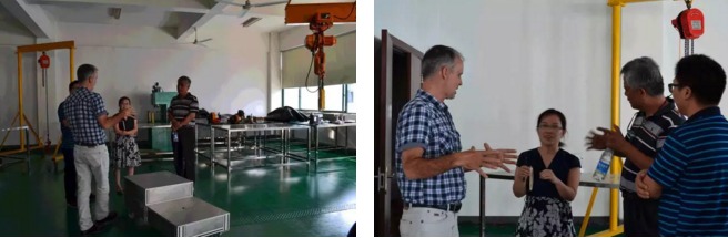 参观莅临车间在工程技术总监和研发总监陪同参观,加拿大NAVITAS老外还兴致勃勃的参观我司舵轮生产车间及实验室