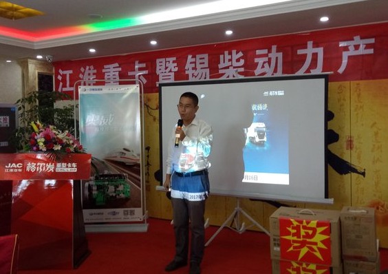 江淮重卡区域经理张然介绍了江淮重卡六安地区的销量及份额情况,并详细介绍了K系车型搭载“锡柴国五” 产品的优势、亮点。