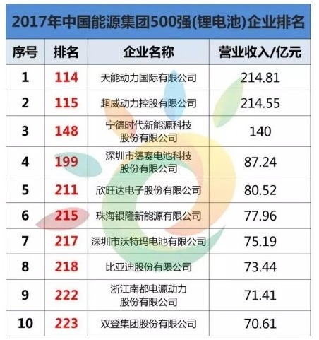 近日,“2017中国能源集团500强”榜单在北京揭晓,新能源和节能环保企业成绩靓丽,有不少储能及电池企业源集团500强”第114位,稳居储能及电池行业第一,也成就了中国锂电池企业在新能源领域举足轻重的地位。