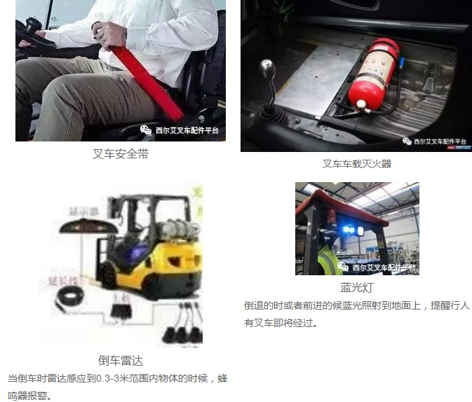 叉车出厂自带的安全装置有刹车、停车制动器、各种指示灯、喇叭、倒车蜂鸣、行车闪光灯、大灯、叉齿定位销、后视镜、护顶架、双叉靠背等,请看图注意认识它们。