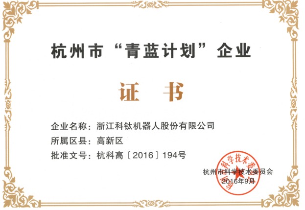 日前,浙江科钛机器人股份有限公司获得杭州科学技术委员会认定,入选杭州市“青蓝计划”企业。