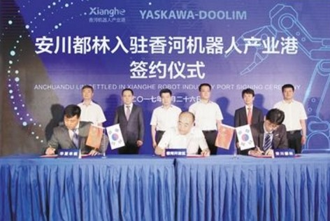 在ATI、尼玛克等世界机器人巨头相继入驻之后,又一全球顶尖机器人企业落户香河机器人产业港。9月26日,世界工业机器人“四大家族”之一的安川都林入驻香河机器人产业港签约仪式在香河规划展览中心举行。