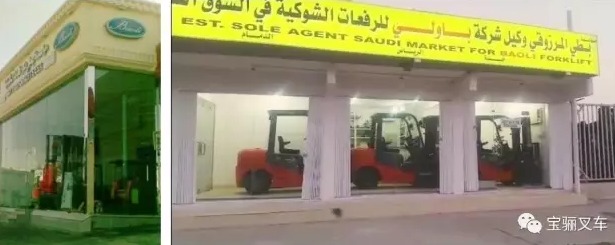 下图为宝骊叉车在沙特阿拉伯的经销商门店,门店内摆放着品类齐全的宝骊叉车,等待客户的选购。
