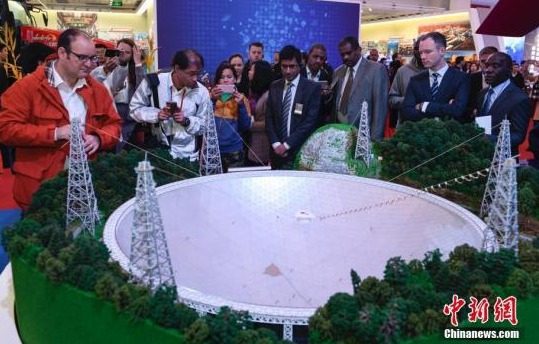 10月13日,上百名外国驻华使节、国际组织驻华代表及部分外国专家等在北京集体参观了“砥砺奋进的五年”大型成就展。图为观展嘉宾关注“中国天眼”FAST模型。