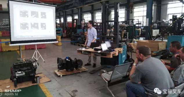 培训会主要讲解了关于内燃叉车和电动叉车各个部件的知识,如宝骊产品的特点、叉车维护指南以及包括变速箱、制动系统、液力及电子系统在内的关键零部件等。