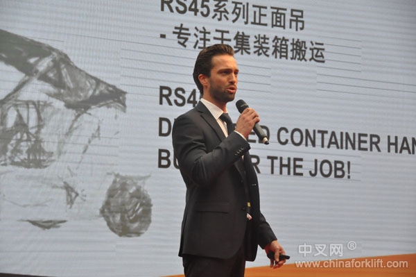 美国纳科集团荷兰工厂大叉技术专家Niek Willems先生,为嘉宾隆重介绍了海斯特RS系列正面吊。据Niek先生介绍:RS45系列正面吊是基于亚太地区客户用于搬运集装箱而设计,专为港口、码头运营中的集装箱搬运而开发,且总拥有成本极低的新型正面吊,拥有极快的作业速度,可大幅度提高工作效率,适用于严苛的工况,极高的耐久性能,便于维修,正常运行时间更长等特点。RS45的优化包括匹配合理的发动机、稳定的车体和集装箱搬运专用大臂,保证了车辆的坚固可靠,降低使用成本。相对于排量更高,功率更大的发动机,其油耗最多可节省 15%,轮胎的使用寿命也更长。按需响应的液压系统和冷却技术可节省燃油并延长相关零部件的使用寿命。配有快断型锁扣的上盖板可轻松拆卸,快速检修主要的零部件。整车及吊具采用CANBUS 系统传输数据,可轻松、快速完成故障诊断。双速举升系统可大幅提高空载时的举升速度及极快的加速性能,满足集装箱堆场对生产效率的要求。匹配的发动机和变速箱微动控制功能可以保证快速、正确地完成集装箱的堆垛作业。宽敞的驾驶室采用了人体工程学设计,可前后滑动,控制装置的位置直观易懂,便于高效地进行操作。