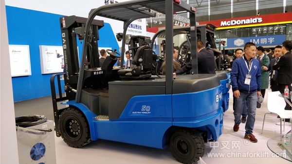 此次亮相的CPD50平衡重叉车是比亚迪叉车家族中新的一员,其额定载重5.0吨,采用先进动力系统,配备AC全交流驱动电机,动力强劲可媲美燃油叉车;相较同类叉车具有更小的转弯半径,更好的性能表现和平衡性。作为比亚迪最新款大吨位叉车,CPD50具有以下优势: