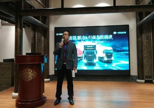 江淮重卡区域经理吴其华介绍了江淮重卡宿州地区的销量及份额情况,并详细介绍了K系车型搭载“锡柴国五”产品的优势、亮点。