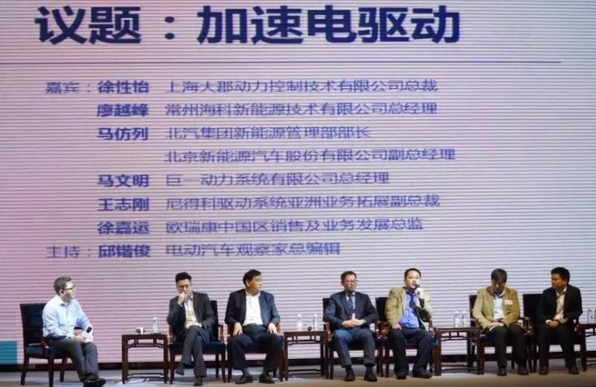 尼得科驱动系统亚洲业务拓展副总裁王志刚,上海大郡动力控制技术有限公司总裁徐性怡、常州海科新能源技术有限公司总经理廖越峰、北汽集团新能源管理部部长、北京新能源汽车股份有限公司副总经理马仿列、巨一动力系统有限公司总经理马文明,欧瑞康中国区销售及业务发展总监徐嘉运,在电动汽车观察家总编辑邱锴俊的主持下,围绕“加速电驱动”展开讨论。