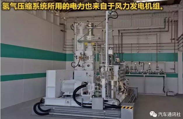 氢气电解出来之后,要压缩到0.8MPa(也就是8个大气压的压力)进行储存。然后会有氢气运送车辆进入制氢站加注高压氢气,然后再运送到物流部门供12台氢燃料电池叉车满负荷全天使用——但是丰田的这个制氢站,其风力发电机发出来的电有75%是供给电力公司的,只有25%是用于制氢,而且由于位置不是很好,每年的发电量其实不高——如果是建在风力资源丰富的地区——例如中国新疆吐鲁番,保守估计,一台风力发电机组就可以满足1000辆燃料电池车的日常用氢需求,毕竟不是每台车每天要跑几百公里的。