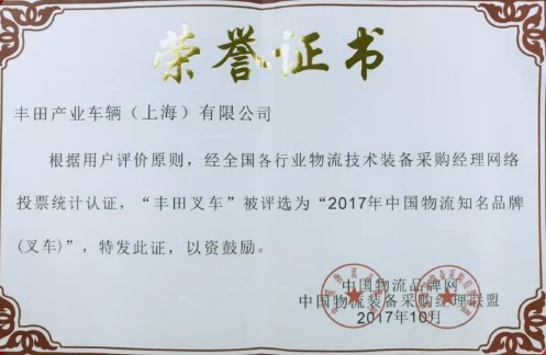 最终,在全国各行业物流技术装备采购经理在线投票统计认证下,丰田叉车被评选为“2017年中国物流知名品牌(叉车)”。