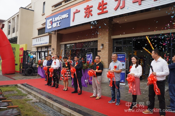 接下来广西柳工机械股份有限公司邓锦瑜、盘承波,安徽柳工起重机有限公司赵跃与广东生力华柳工机械销售服务有限公司廖其章、李让娟、张北厚、杨刚、黄泳媚嘉宾为中山公司开业剪彩,在喜庆乐曲声与在礼花礼炮中,全体到会人员以热烈的掌声庆祝中山公司乔迁之喜。