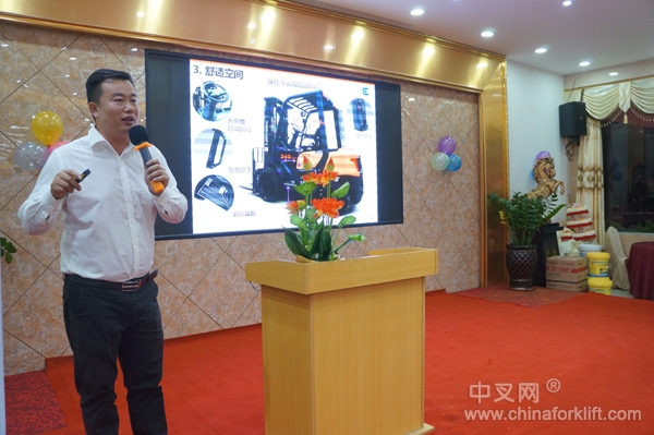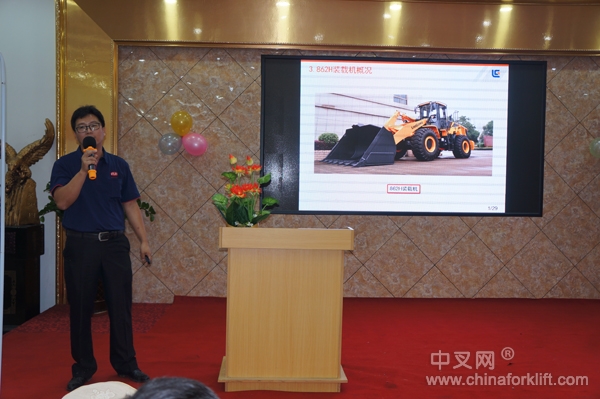 接下来由广东生力华柳工机械销售服务有限公司叉车产品总监杨刚先生与广东生力华柳工机械销售服务有限公司副总经理张北厚先生对柳工的产品做了简单的介绍。杨刚在介绍柳工叉车时,柳工新一代C系列内燃叉车的卓越性给在场的嘉宾留下了深刻的印象:柳工C系列内燃叉车具有动力强劲、动力传输稳定、操控灵敏高效、制动安全可靠、驾驶舱设计舒适、智能化控制、柳工风格,性能稳定、维修保养方便等特性。张北厚在介绍柳工CLG862H轮式装载机时,谈到:柳工CLG862H轮式装载机总体采用计算机优化设计,集数字技术和仿真技术于一身,充分利用柳工设计、制造优势,在一贯领先的大型装载机制造技术的基础上,装备目前国内外一流元部件,使整机性能达到世界领先水平,为大型施工工程提供有力保证。