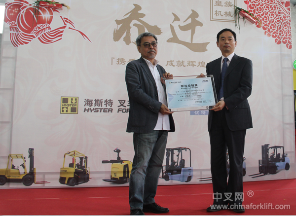 接下来举行了优特力叉车品牌授权仪式,由上海海斯特叉车制造有限公司总经理叶勇先生代表海斯特授权给广州皇簇机械设备有限公司,总经理袁炳辉先生代表皇簇接受叶总的授权。