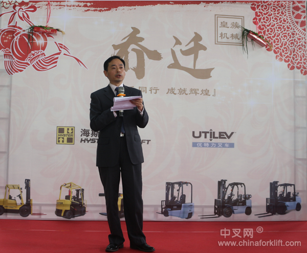 上海海斯特叉车制造有限公司总经理叶勇先生在致辞中带来了厂家对皇簇乔迁的祝贺、与皇簇多年良好的合作关系的肯定。叶总说:我代表海斯特参加海斯特金牌代理商广州皇簇机械设备有限公司的乔迁典礼,对广州皇簇机械设备有限公司表示热烈的祝贺,祝愿皇簇未来基业长青、大展宏图。美国海斯特-耶鲁(HYSTER-YALE)集团做为全球最大的叉车制造商之一,集产品设计、研发和制造为一体,通过广泛分布的全球业务和一贯的管理流程,为全球用户提供全系列的叉车产品及服务,旗下的海斯特(Hyster®)、耶鲁(Yale®)和最新的优特力(UTILEV®)三大叉车品牌, 以强大的品牌组合, 服务于高端、标准及实用等不同的细分市场。早在2000年,香港力高机械与海斯特合作,成为海斯特第一批授权的代理商,海斯特在香港的业务逐渐扩大。2005年,随着广东地区业绩蒸蒸日上,广州皇簇正式成为海斯特在广州、佛山的代理商。17年的相随相伴,已成为海斯特忠实的客户群,海斯特为有广州皇簇这样的金牌代理商感到自豪与荣幸,海斯特坚信,未来我们的合作关系将会越来越紧密。