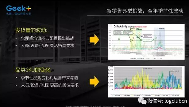 其次是商品的品规上,以服装行业为例。有一个客户夏天发的是T恤,同样一个物流容器里面可以装20、30件,冬天发羽绒服可能只有6件、8件。由于品规的变化,仓储的物流容器,包括设备,还有人员里面的配置都需要应对这种变化和要求。