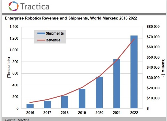 根据Tractica的最新预测,到2022年,全球企业机器人出货量将从2016年的83,000台增长至120万台,此期间复合年均增长率在57%左右。全球企业机器人市场收入将从2016年的59亿美元增加至679亿美元。