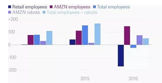 据大西洋(600558,股吧)传媒(the Atlantic Media)旗下最火的新媒体Quartz 报道,亚马逊在2017年新增7.5万个机器人,取代了17万零售岗位。分析认为,尽管亚马逊零售总额只占美国零售行业营收3%,但增长势头迅猛,在一定程度上反映了零售业的发展趋势。