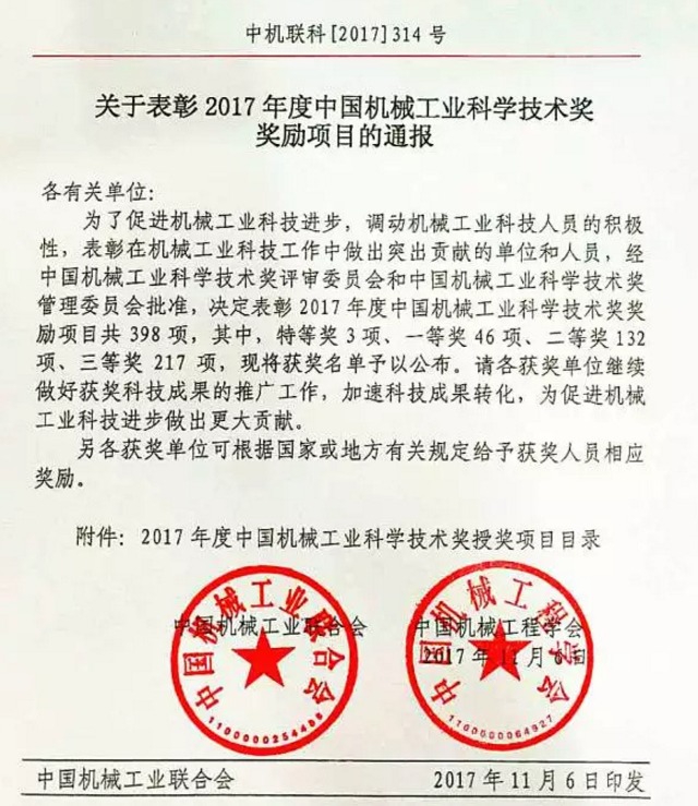 据悉,中国机械工业科学技术奖是由中国机械工业联合会和中国机械工程学会共同设立的面向全国机械行业的综合性奖项,也是目前国内机械行业中唯一由国家批准设立的奖项,是中国机械领域最具权威的奖项之一。