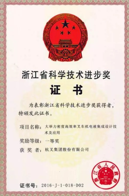 近日,2017年度中国机械工业科学技术奖颁奖大会在济南隆重举行。杭叉集团股份有限公司和浙江大学合作的“大举力密度高效率叉车设计制造关键技术研究”项目喜获科学技术一等奖。这是该项目继荣获2016年教育部科学技术进步奖一等奖和2016年度浙江省科学技术进步一等奖后的又一殊荣。