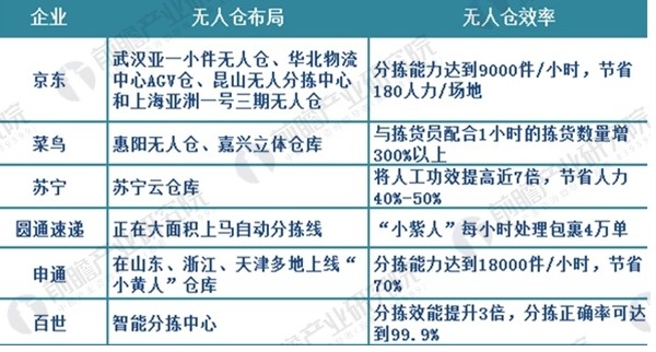 而据前瞻统计,除了京东外,电商巨头阿里和苏宁,物流巨头申通和圆通等均加大了无人仓方面的布局,如阿里今年8月份启动的惠阳无人仓是我国实际投入使用的规模目前最大的无人仓库;苏宁双十一前全面上线了云仓库;圆通则从上海中心开始,正在大面积上马自动分拣线……无人仓正在我国遍地开花。