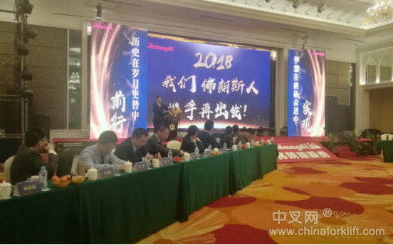 侯总在总结的第三部分,对已经来临的2018年度经营管理工作进行了展望和具体任务的部署。他要求佛朗斯股份全体员工戒骄戒躁,在成绩面前一定要继续努力,完善各方面的不足之处,紧紧把握中国叉车租赁的发展大潮,坚决贯彻落实公司董事会制定的经营发展战略,把“既快又好”作为经营管理的主体指导思想,突出强调“快”字为先,“好”字跟上,准确把握好经营速度和质量两个方面的协调发展。要求公司在2018年度完成在租台数22000台的叉车租赁目标,全面落实以叉车租赁作为主营业务,有机结合维修配件、整机销售业务的三位一体综合业务发展战略,进一步巩固佛朗斯股份在中国叉车后市场行业的领军企业地位。