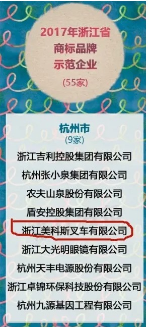 近日,我省公布了2017年浙江省商标品牌示范县(市、区)示范乡镇(街道)和示范企业名单,我区美科斯叉车有限公司被确定为2017年浙江省商标品牌示范企业。
