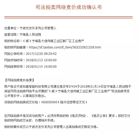 该标是宁波如意全资子公司——宁波如意智能科技有限公司通过竞买号I7434在宁海县人民法院于淘宝网司法拍卖网络平台开展的“(破)宁海县大佳何镇工业区新厂区工业房产”司法拍卖项目公开竞价中,以最高应价胜出。该标的网络拍卖成交价格:¥65050000(陆仟伍佰零伍万元)。