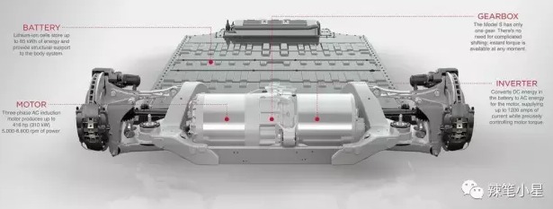 如下P85D后轴增强电驱系统示意图可见其由峰值功率310kW的交流感应电机(左)、变速箱(中)和峰值电流1200安培的电驱控制器Inverter(右)组成。电驱控制器的体积已经基本和电机相当。