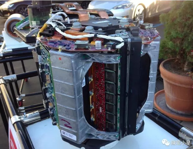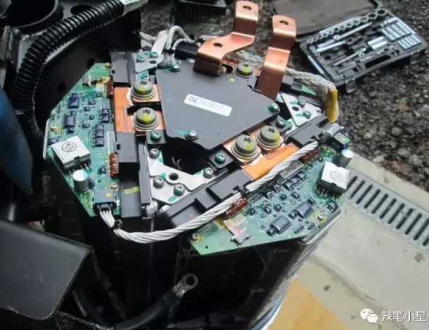 特斯拉电驱控制器最终通过底部的交流输出母线来将驱动电流输出至大功率交流感应电机。其交流输出母线上还集成了电流传感模块。交流输出母线直接对接电机交流母线接口,省去了高压线束。这样节省成本的同时提高了可靠性。如示意图所示,大功率交流感应电机紧凑地和变速箱整合在一起。