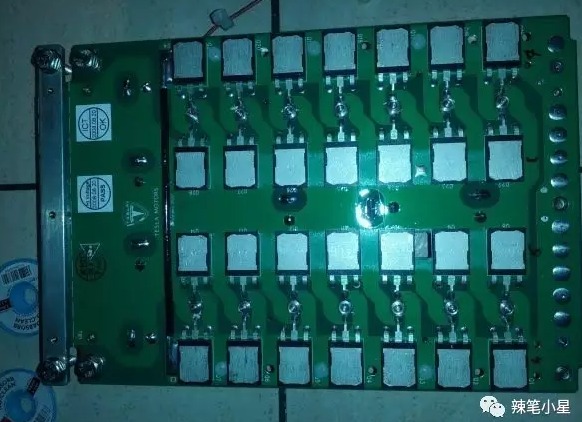 如下功率板的照片可以看到每一相的功率板包括4排,每排7个塑封IGBT芯片。共28个IGBT组成的高压驱动半桥(每个半桥包含两个驱动门)。三相驱动共包含3块这样的功率板,共84个塑封IGBT。通过每驱动门14个IGBT的并联,功率和电流得到分散,从而简单直接的降低了散热要求。因此使用塑封封装和传统PCB成为可能。
