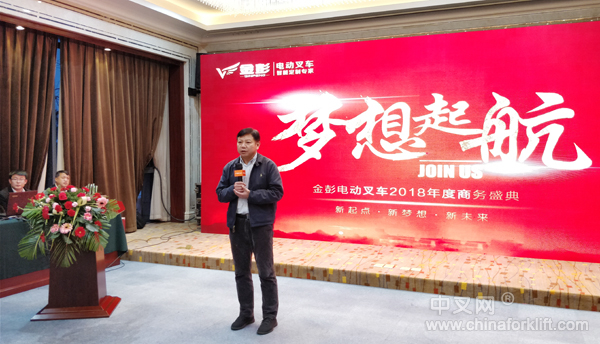 1月28日,金彭电动叉车以探索发展新路子,在以中叉网(www.chinaforklift.com)为代表的多家行业媒体、行业名流,以及来自全国各地的经销商家人们的见证下,以“梦想起航”为主题召开电动叉车2018年度商务盛典,并发布了2018发展战略和主打新品。
