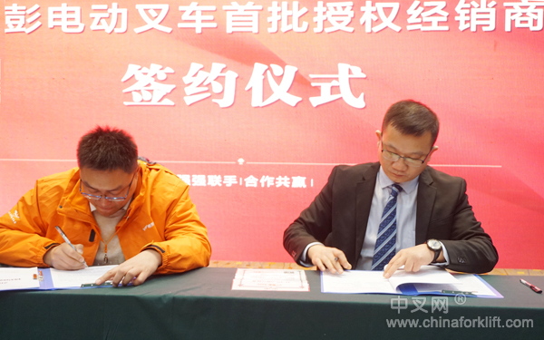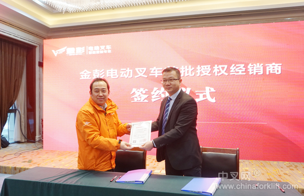 在2018年金彭电动叉车年会上,又有十六家经销商加入金彭电叉的大家庭,签约金额达2500万。充分体现了经销商对金彭电动叉车在2018年的营销信心。金彭叉车总经理朱作军与经销商一一签约,制定2018年营销计划,通过一一部署,全国经销网络的建设,计划在2018年实现百家专营店的市场网络布局。