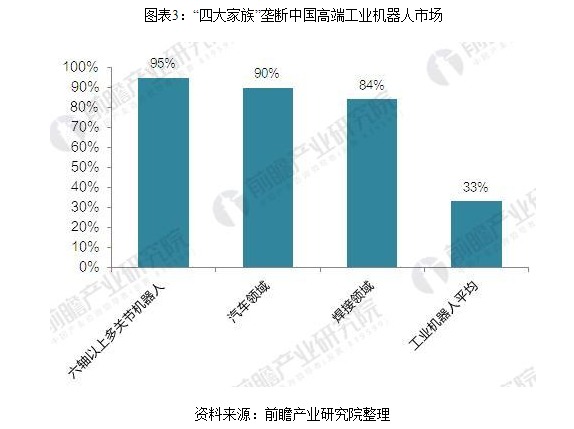 而且这些竞争还都集中在中低端领域,高端领域国产工业机器人的份额不到5%。在六轴以上多关节机器人,“四大家族”的份额超90%,处于绝对垄断地位;在下游应用领域中,作业难度大、国际应用最广泛的焊接领域,国外机器人占84%;高端应用集中的汽车行业,国外公司占90%份额。同时,受益于机器人成本下降,外资巨头开始下调产品价格,以进一步提升市场占有率。