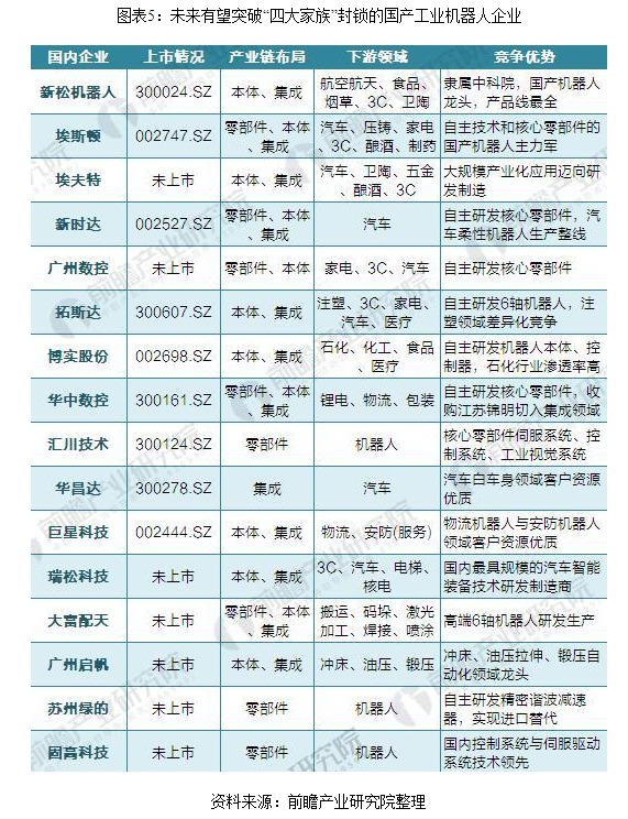 目前国内机器人行业具有代表性的企业有新松、埃斯顿、埃夫特、广州数控、新时达、拓斯达、巨星科技、华昌达等。这些公司已在机器人产业链中游和上游进行拓展,通过自主研发或收购等方式掌握零部件和本体的研制技术,结合本土系统集成的服务优势,已经具备一定的竞争力,未来有望实现对国外品牌的进口替代。