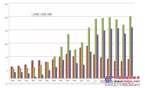 中国工程机械工业协会据海关总署数据整理,2017年我国工程机械进出口贸易额为241.91亿美元,同比增长19.3%。其中进口金额40.86亿美元,同比增长23.2%;出口金额201.05亿美元,同比增长18.5%,贸易顺差160.19亿美元,同比扩大23.76亿美元。