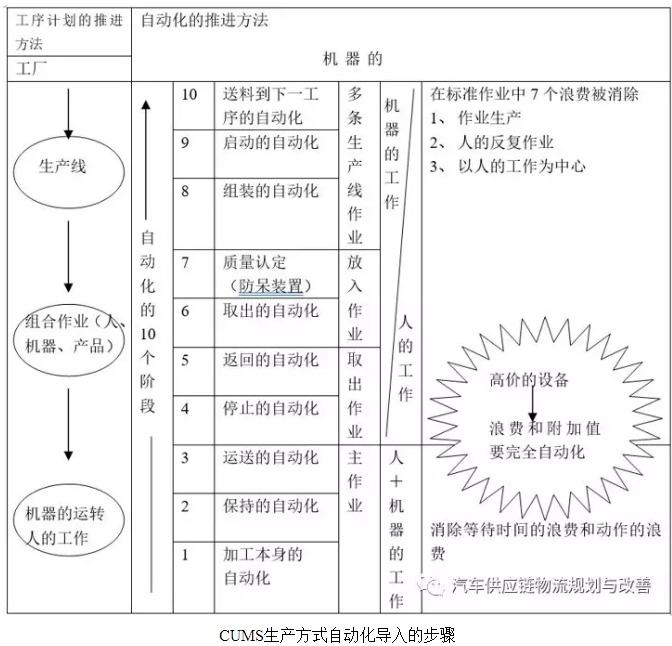 10、自动化。”自动化是指发生在异常的时侯自动停止“。本来,用机器的目的就是排除人的作业。因此,推进机械化的过程就是走向自动化的一环。然后,如果走错一步,即使能减轻人的作业也不能排除人的作业。这里,从投资或效果的关系解释了”脱离人“最有效的自动化推进方法的10个阶段。