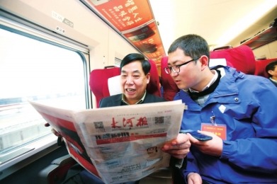本报讯昨天下午,在驻豫全国人大代表赴京的高铁上,高铁工作人员第一时间将当天的《大河报》送到代表们的手中。不少代表认真翻看大河报,同时对本报推出的“大河小AI”机器人采访全国两会,纷纷点赞。