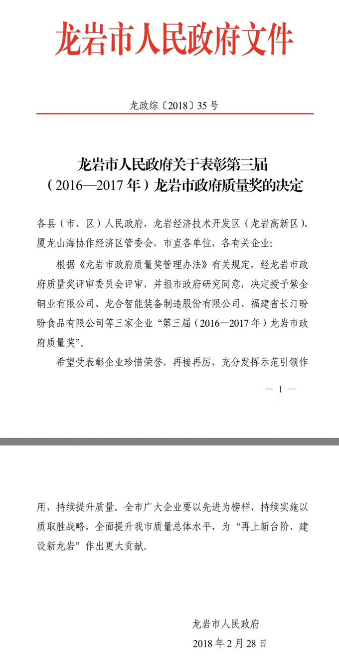 近日,中叉网记者获悉龙合智能装备制造有限公司与紫金铜业有限公司、福建省长汀盼盼食品有限公司一起荣获“第三届(2016-2017年度)龙岩市政府质量奖”。
