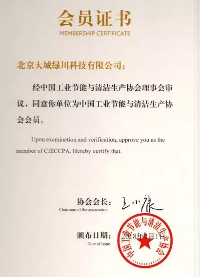 经过严苛的准入条件审核,北京大城绿川科技有限公司(以下简称“大城绿川”)于2018年2月1日正式获准加入中国工业节能与清洁生产协会。近日,大城绿川公司收到了协会正式颁发的会员证书。