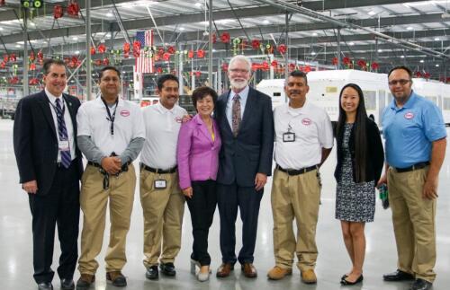 2017年10月6日,兰卡斯特电动大巴工厂竣工,李柯与兰卡斯特市长(右4)及员工代表合影
