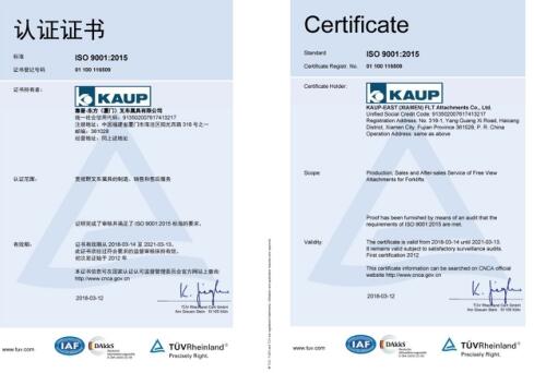 日前,经过前期充分的准备,靠普-东方(厦门)叉车属具有限公司顺利通过了德国TÜV莱茵认证公司为期三天的换证升级审核并取得了新版本质量管理体系ISO9001:2015的认证证书,成功完成了从ISO9001:2008到ISO9001:2015的转版换证工作。
