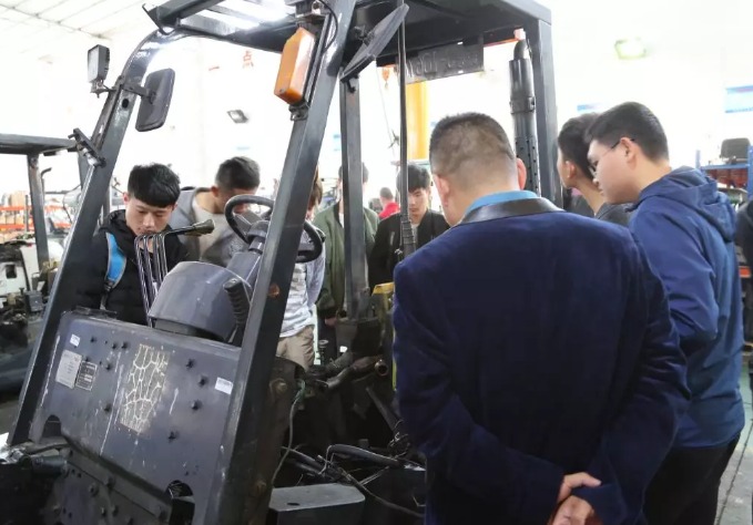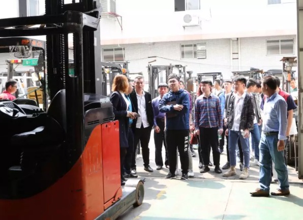 随后,在侯总监的带领下,来访校领导、家长及学生参观了公司园区及华南再制造基地。总部高级技术工程师万强清就叉车的种类、结构和工作原理进行了现场介绍。