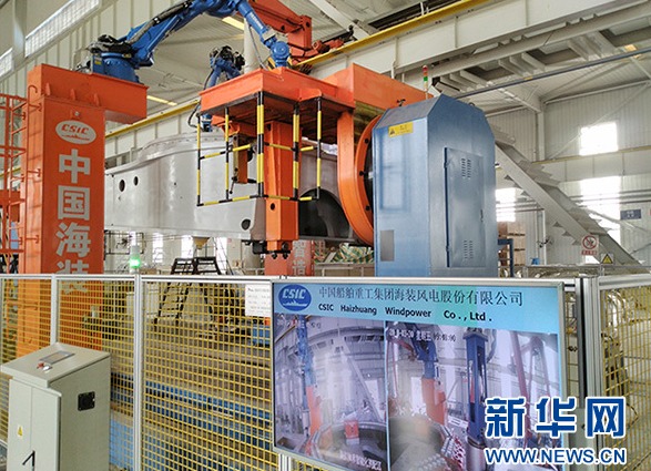 目前,中国海装的组装车间已经引入两台智能机器人,用于偏航轴承和变桨轴承的智能化装配,这两台机器人是由中船重工自主研发,2017年11月正式投入使用。使用智能机器人进行作业后,不仅安装时间相比人工节省了三分之二,力度也能保持一致,还能24小时连续工作,这些都是人工作业无法达到的。