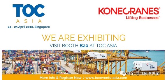 2018年4月24日至25日,第22届亚洲码头运营商会议暨展览(TOC Asia)即将在新加坡滨海湾金沙大酒店举行。作为港口码头集装箱搬运领域的全球科技领先的设备商,科尼将再次参展,展位号:B20